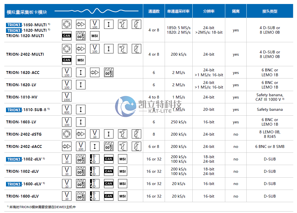 选择我们不同的TRION(3)系列信号调理模块进行模拟信号测量可以实现所有传感器信号 的绝对同步。这些可拆卸替换模块每通道具备独立的AD转换和抗混滤波器,让您的测试具备更 多的灵活性。
